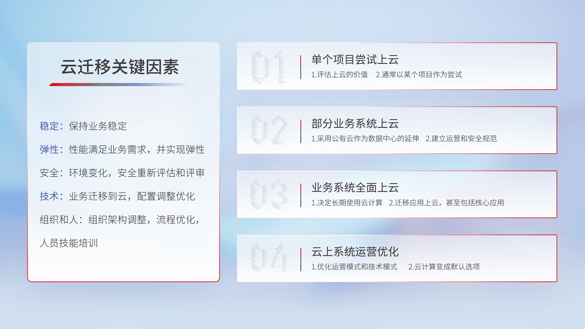 结合实际业务,,,从规划设计、、云平台选型、、、、云原生改造、、、、数据迁移、、、、集成交付,,迁移全过程为客户识别最佳上云路径,,做好风险识别管理,,设计网络架构、、、、身份权限、、、安全审计合规、、操作审计、、、日志审计、、监控告警策略、、、、多站点容灾设计等,,,对云上基础设施进行整体规划,,,提升IT治理水平,,,以满足弹性、、、、高可用、、、、高性能的需求。。。。