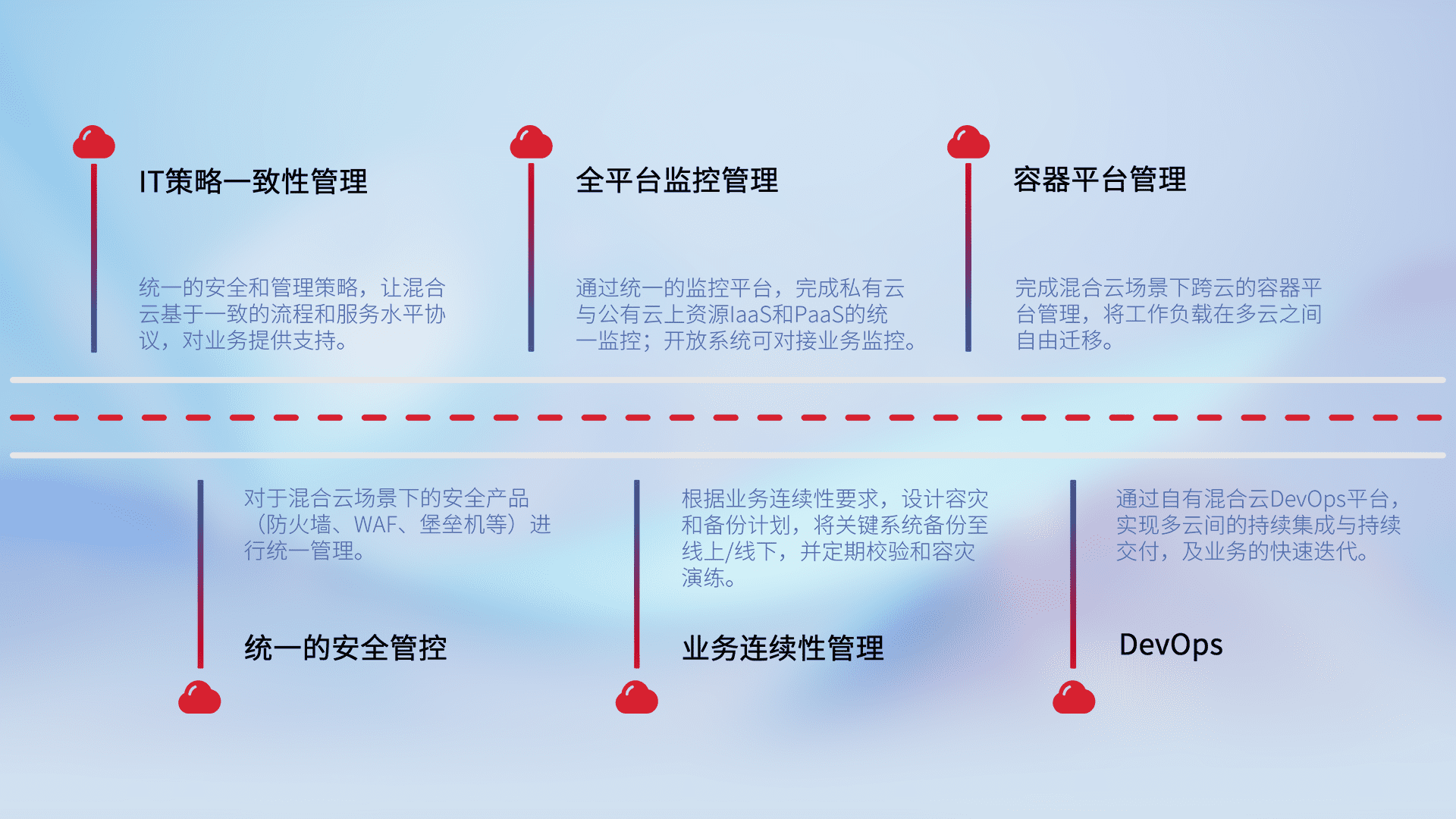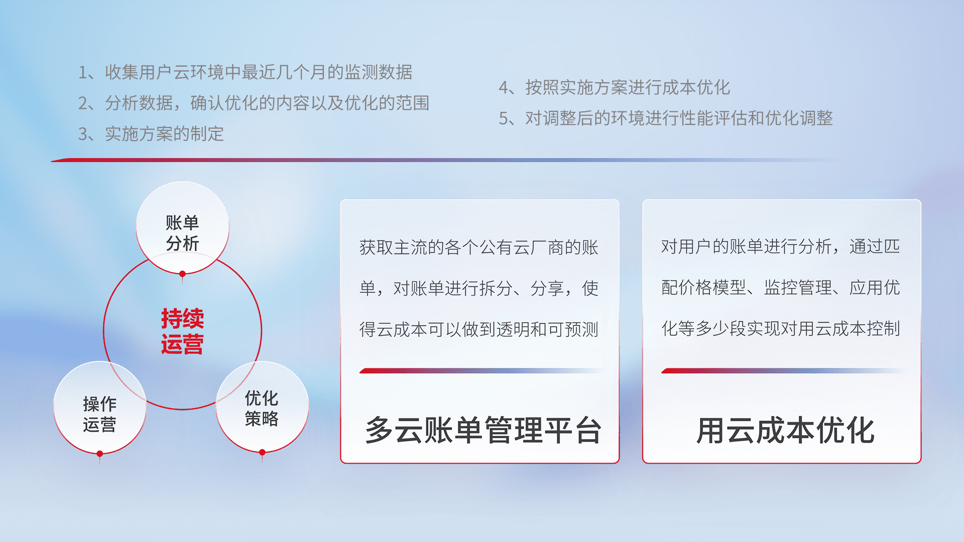 通过多云纳管,,,,以统一的资源数据模型把客户的云资源进行抽象和封装,,,,进而实现对多云资源的统一操作,,保障云资源管理的可靠性、、、稳定性与可用性。。量身定制化运维内容,,配置、、、、开发运维、、、补丁管理、、、备份、、、、监控、、、、认证和访问管理、、、审计和日常巡检等,,保障在用云过程中的可靠度,,,,稳定度以及高可用率。。