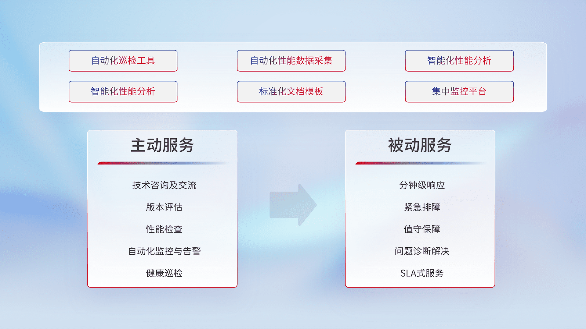 智能化工具和标准化文档,,保障服务质量,,提供主动服务(包含技术咨询、、、版本评估、、、、性能检查、、自动化监控与告警、、健康巡检)和被动服务包含(分钟级响应、、、紧急排障、、、、值守保障、、、问题诊断解决、、SLA服务)。。
